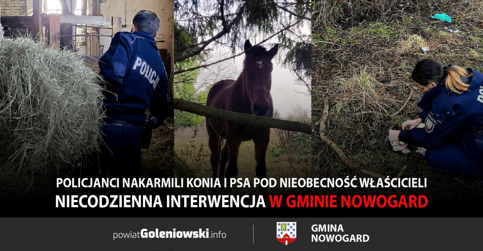 Po ustaleniu, że na terenie posesji nie ma nikogo, kto mógłby zająć się inwentarzem, policjanci z Komisariatu Policji w Nowogardzie zwrócili uwagę na biegające luzem zwierzęta – konia oraz psa. Sytuacja wymagała natychmiastowego działania, aby zapewnić im bezpieczeństwo i podstawowe potrzeby bytowe do czasu przybycia odpowiednich służb lub powrotu gospodarzy.