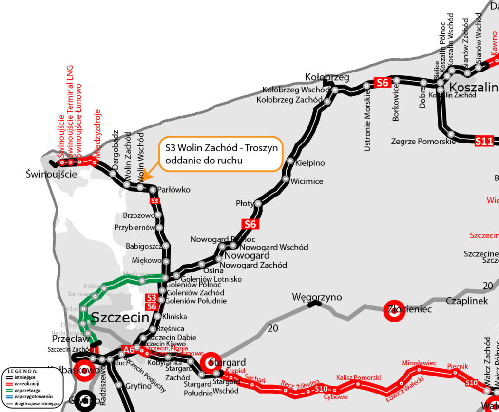 Na sąsiednim odcinku Świnoujście–Dargobądz wciąż obowiązuje zwężenie do jednego pasa, jednak – jak zapowiada GDDKiA – jeszcze w tym miesiącu powinno ono zniknąć. Wówczas cały odcinek S3 ze Świnoujścia do Troszyna będzie w pełni przejezdny w obu kierunkach.